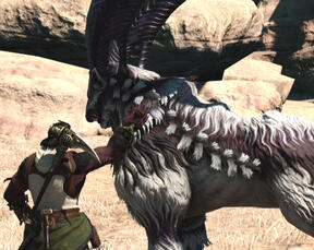 While chocobos are fine and dandy, they're not Xorro's first choice as a beast of burden. Even so, he came across Pycha as a matter of happenstance with the beast trapped in a tight crevice it had fallen into. With some careful excavation, Xorro was able to free the gazelle and tend to it until it regained its strength. However due to an injury sustained to the animal's front right leg, Xorro keeps Pycha as a companion to provide it with a brace and medicines.
